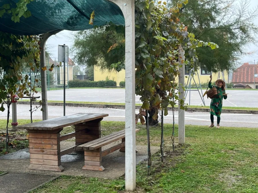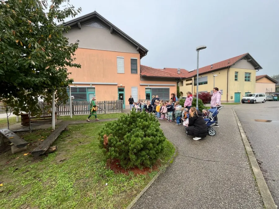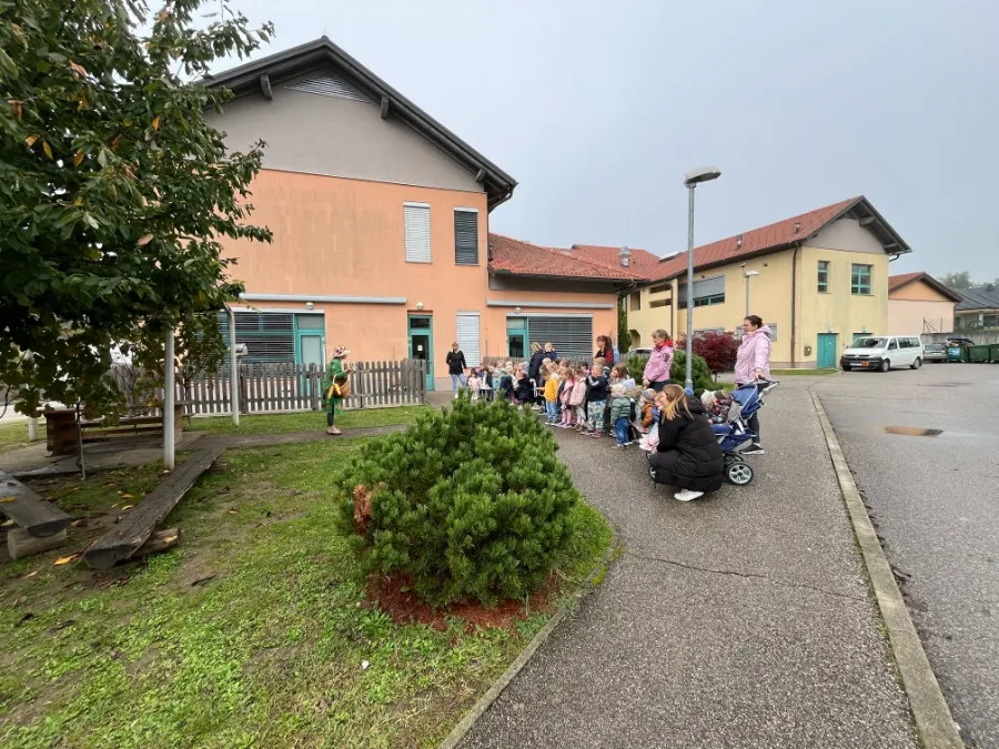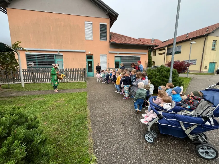 V našem vrtcu nas je obiskala prav posebna gostja – Tetka Jesen.Zbrali smo se na travniku pred vrtcem, kjer nas je Tetka Jesen prijazno pozdravila in nam predstavila, kaj se dogaja v naravi v tem času leta. Pogovarjali smo se o tem, kako listje spreminja barve, kako se živali pripravljajo na zimo in katere jesenske plodove lahko najdemo – kot so jabolka, hruške, kostanji in buče.