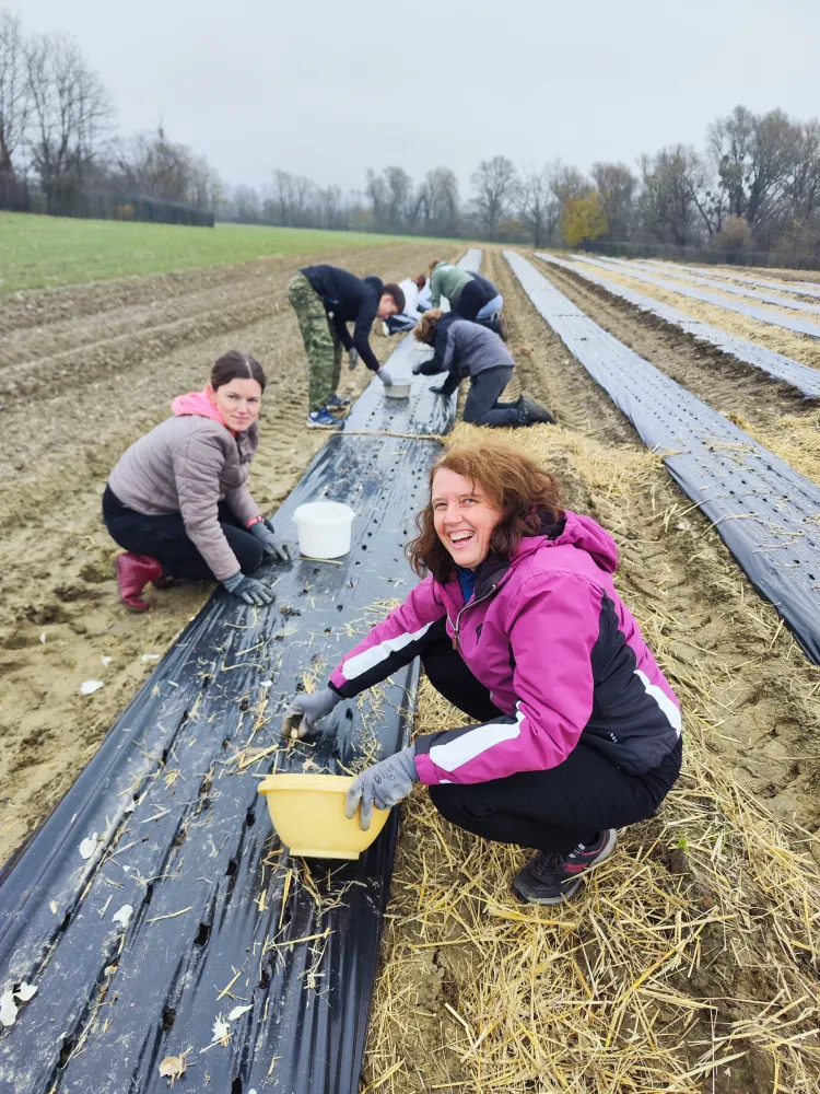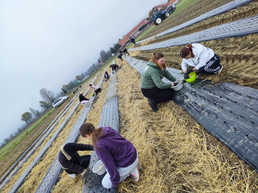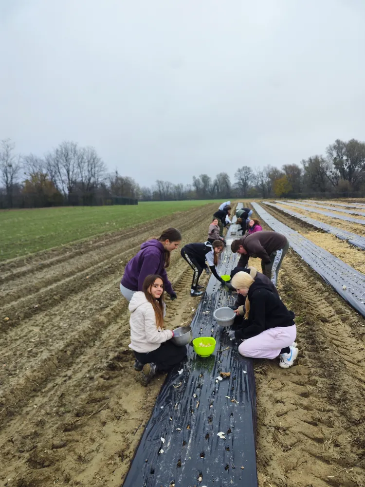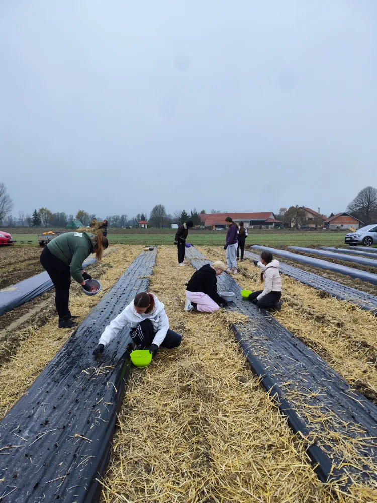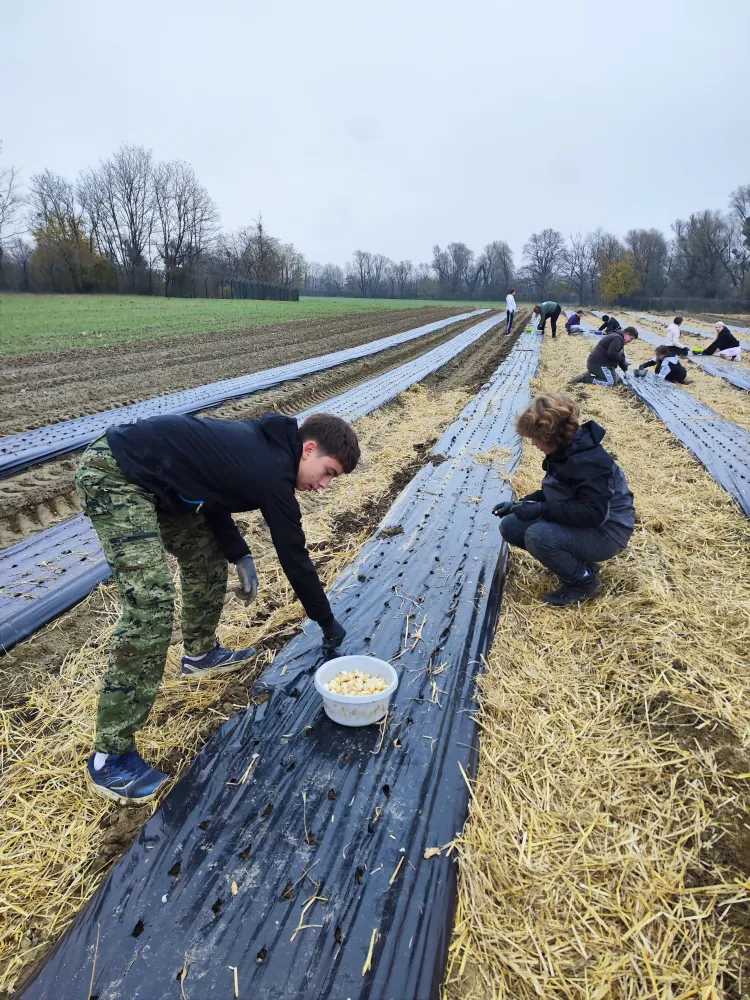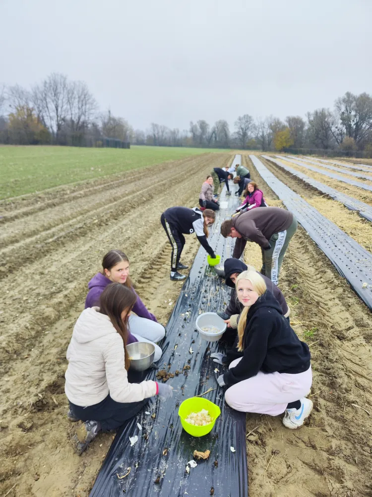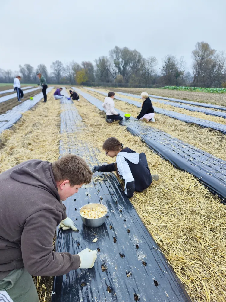Devetošolci sadili česen na ekološki kmetiji Balon