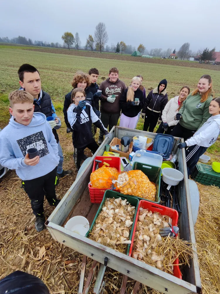 Devetošolci so z veseljem poprijeli za delo in posadili česen. Ob delu so spoznavali, da pridelava hrane zahteva potrpežljivost, ročno spretnost in znanje. Na svežem zraku so uživali v praktičnem učenju in novi izkušnji.